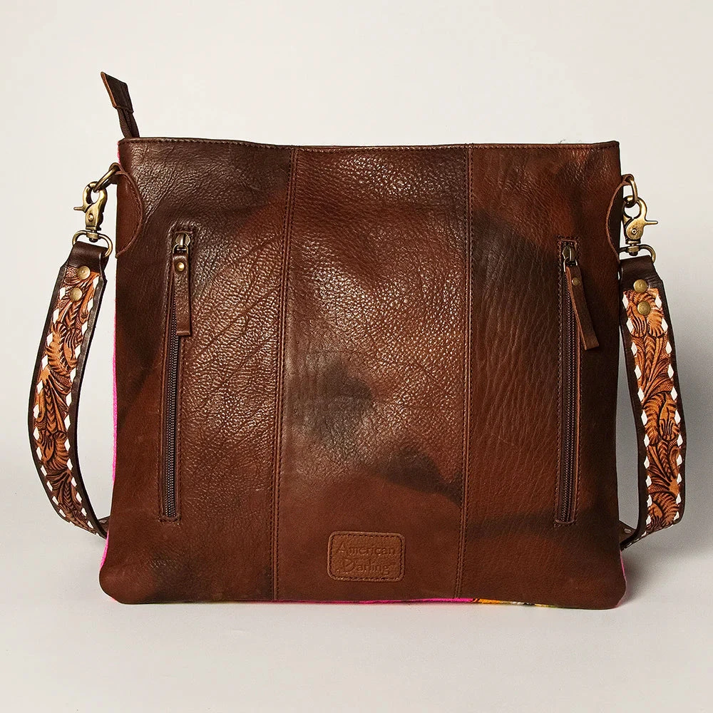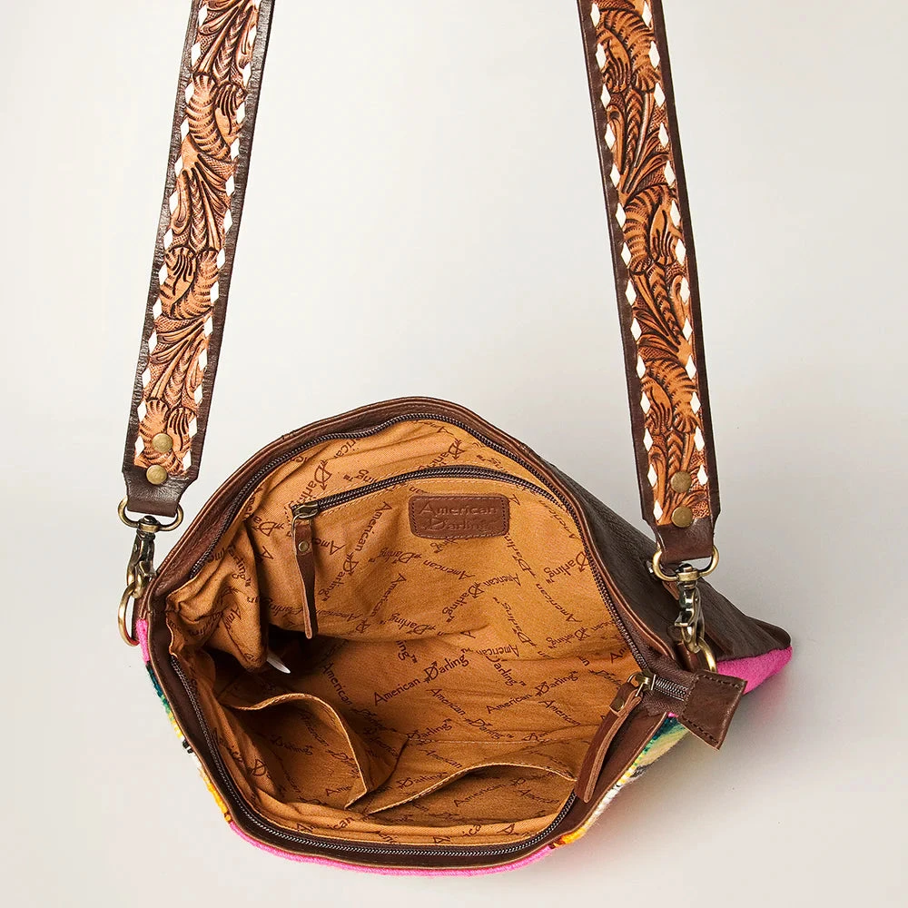 What a fun purse for summer! This fun and fresh pink serape saddle blanket crossbody from American Darling is sure to make a statement + carry everything you need! Featuring buckstitched tooling with a silver/turquoise conch detail, you are sure to add a little Western Flare to any outfit when carrying this bag!Â