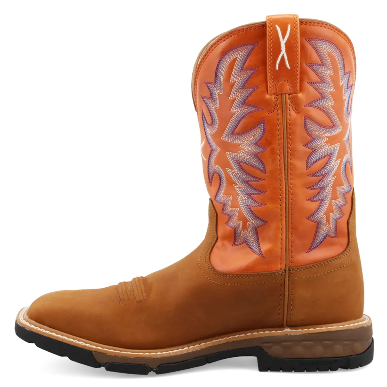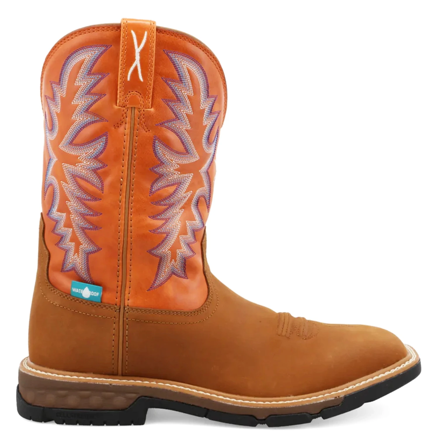 Twisted X Men’s 11″ Waterproof Western Work Boot is built for all day comfort. Handcrafted in full-grain leather with CellStretch Comfort Technology, which is a interconnected network of comfort cells that compress and rebound with every step staking stress off our your legs. For stability and durability, Twisted X has combined a compression-molded EVA midsole, nylon/glass fiber shank, and an EH-rated oil and slip-resistant molded rubber outsole.